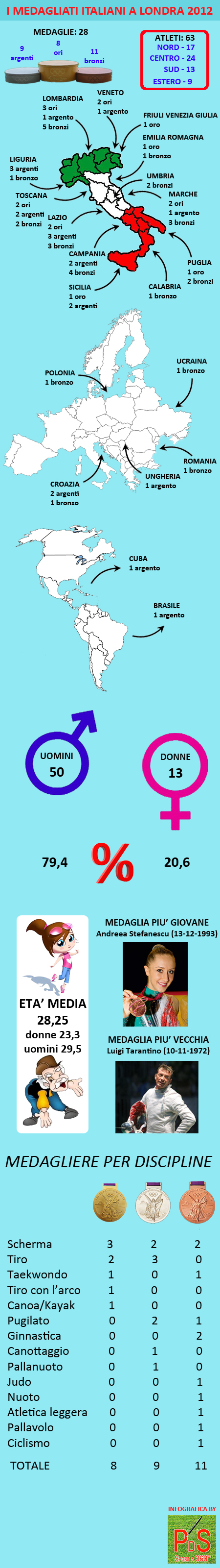 A prevalere è il centro della penisola, con 24 atleti, mentre solo 13 provengono dal meridione. A colpire è l’alto numero di medagliati nati all’estero: ben 9, con un tris di croati su tutti, ma anche Brasile o Cuba, con cui la nazionale di pallavolo ha veramente trovato l’America. Per quel che riguarda l’Italia, poche le regioni rappresentate: su tutte domina la Lombardia con 9 rappresentanti, mentre restano a secco Valle d’Aosta, Piemonte, Trentino Alto Adige, Abruzzo, Molise, Basilicata e Sardegna. Tre atleti rendono Roma la città più vincente, e lo stesso discorso vale anche per la provincia, ma in questo caso in coppia con Ancona: per entrambe sono 5 i medagliati, e per il capoluogo marchigiano molto è dovuto alle schermidrici di Jesi. Proprio quelle che insieme ai colleghi maschi hanno fatto il boom a Londra, con 12 atleti sul podio per 7 medaglie generali (altro che il nuoto, fermo a una).