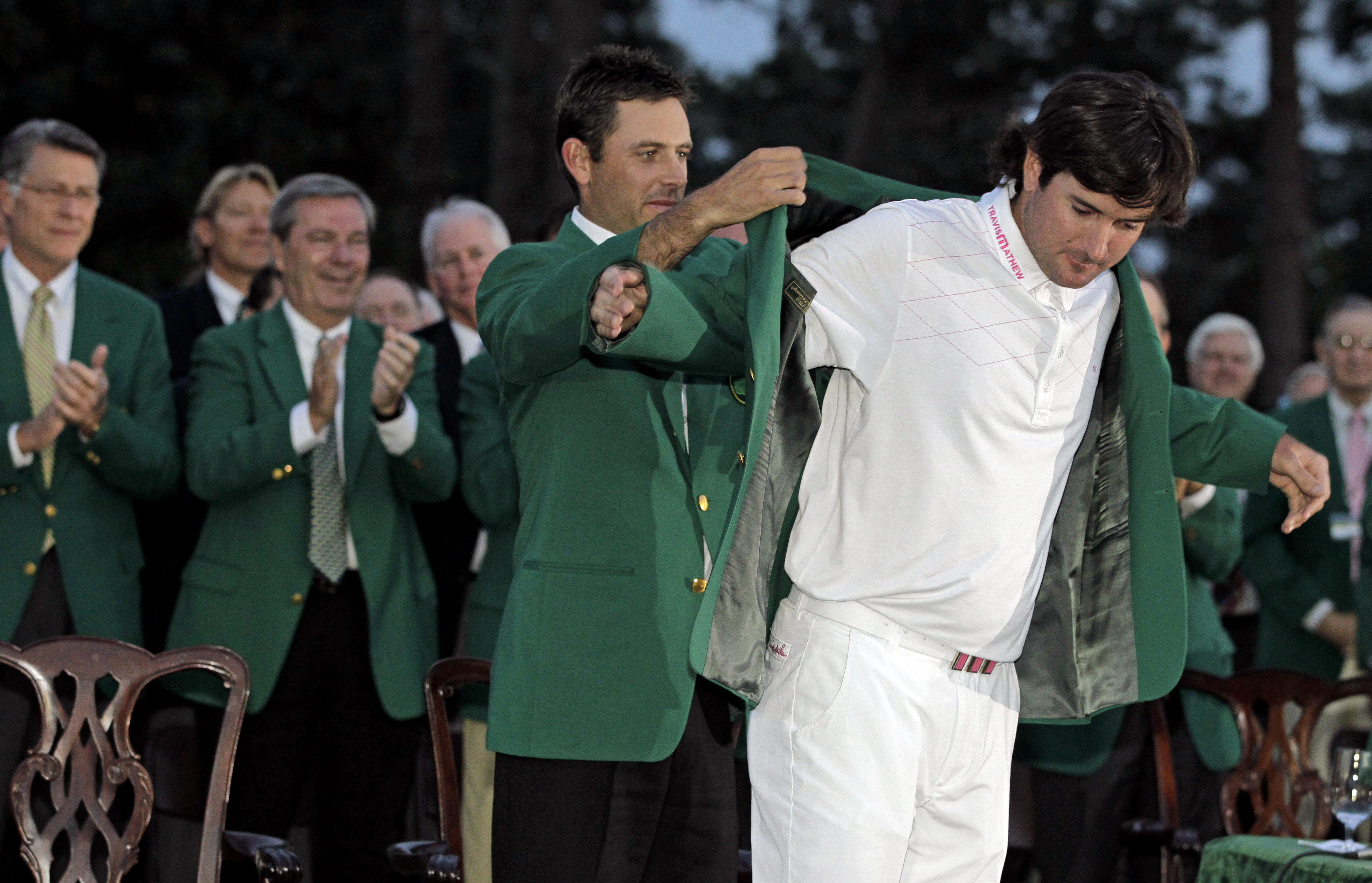 Charl Schwartzel, vincitore 2011, consegna la “green jacket” a Bubba Watson, vincitore del Master 2012 (AP Photo/Darron Cummings)
