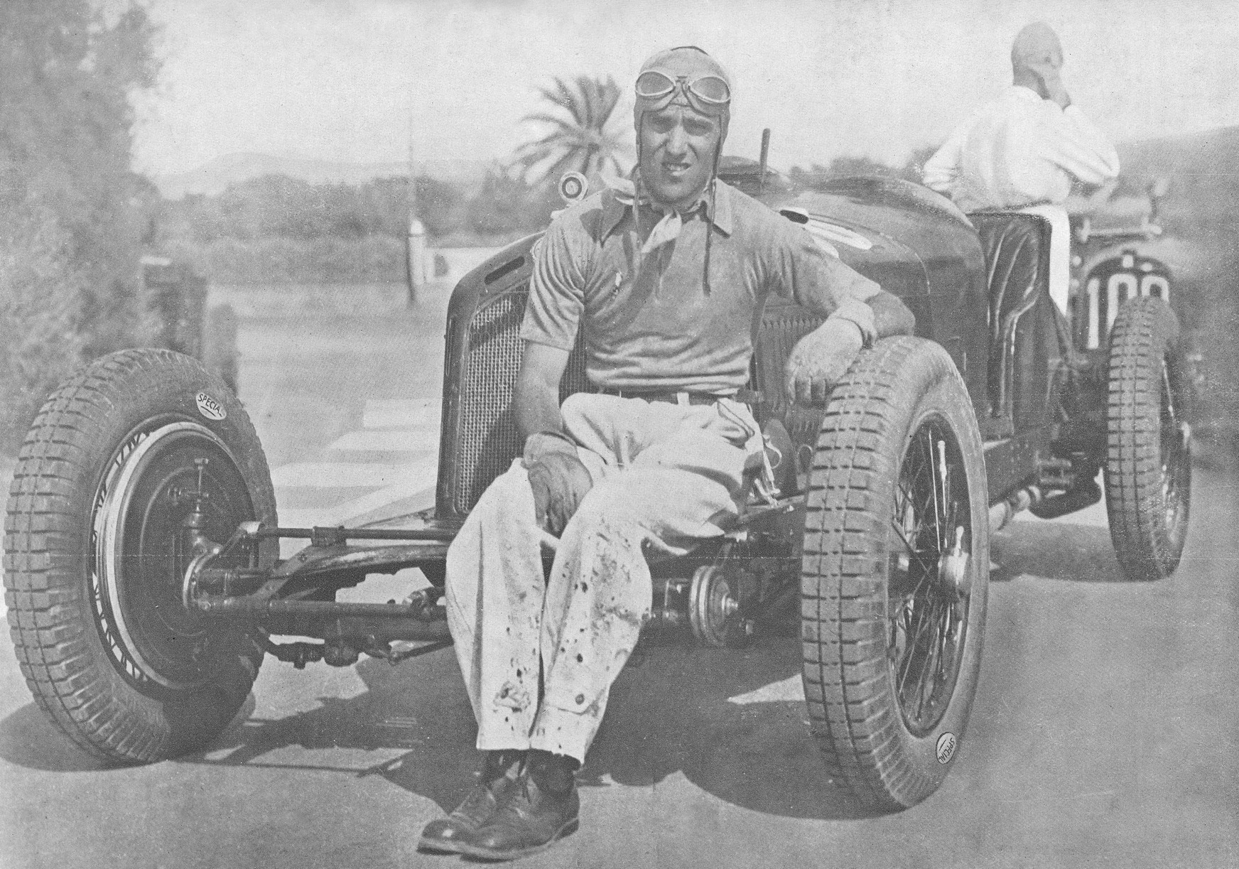 Tazio Nuvolari il 2 agosto del 1931, prima della partenza dell’XI Circuito del Montenero Coppa Ciano, si appoggia sorridente alla sua Alfa Romeo 2300 8C. (foto Circuito del Montenero)