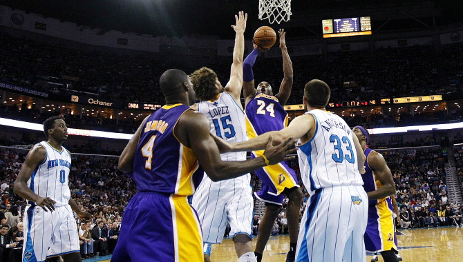 Kobe Bryant nel preciso momento in cui realizza il canestro con cui arriva, più giovane nella storia Nba, a 30000 punti (Foto AP/Gerald Herbert)