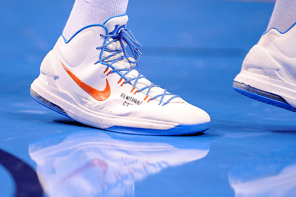 La scarpa di Kevin Durant con la scritta in ricordo delle vittime del Connecticut (Foto Jerome Miron/Usa Today)