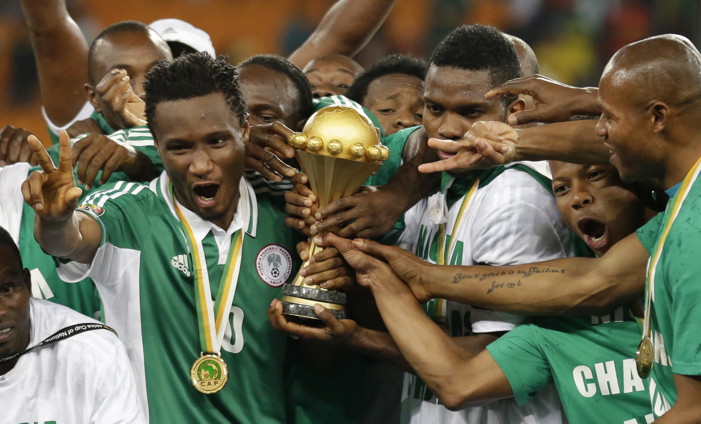 Il centrocampista del Chelsea John Obi Mikel (sinistra) festeggia con il trofeo della Coppa d’Africa dopo la vittoria per 1-0 in finale sul Burkina Faso (AP Photo/Rebecca Blackwell)