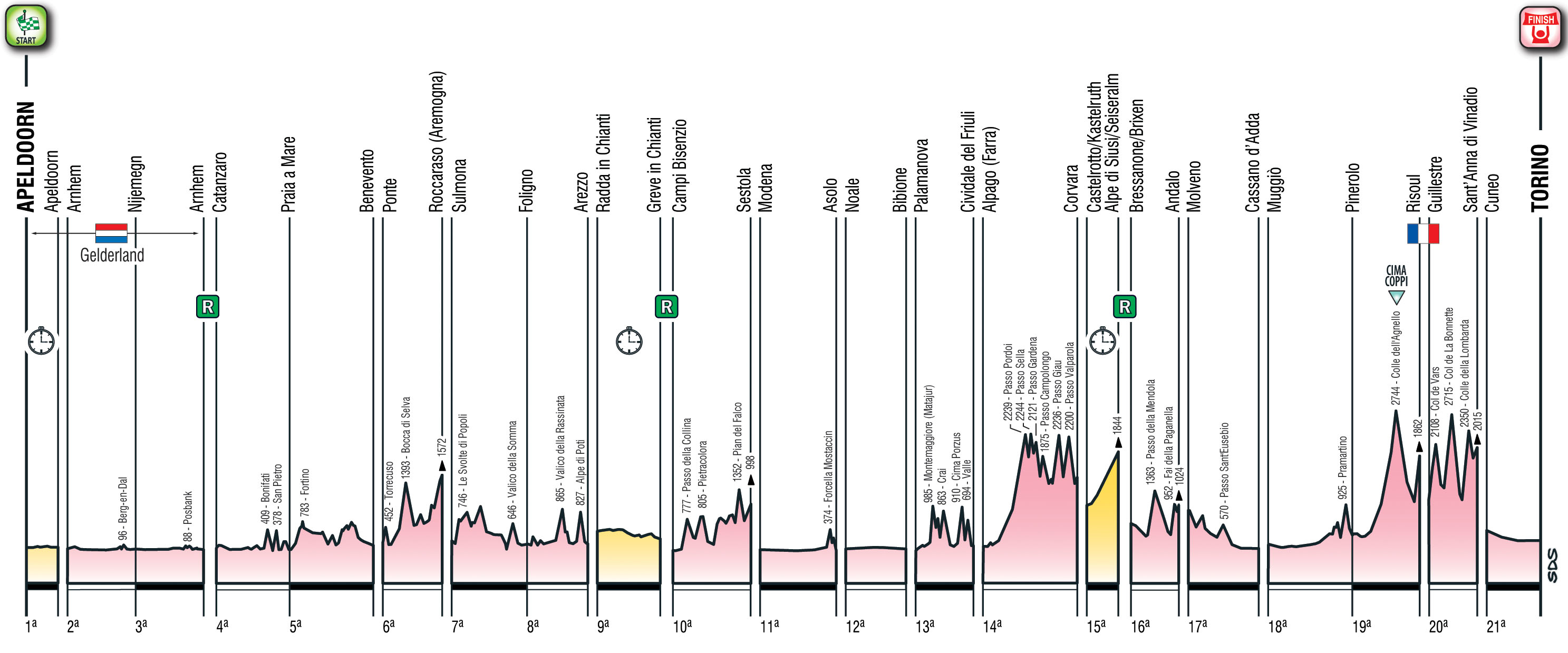 E tante, lo abbiamo detto, sono anche le salite. Non tanti gli arrivi in salita, solo quattro, e spesso l’ascesa più dura della giornata non sarà nemmeno l’ultima del menù, ma tanta strada per fare la differenza. Con una goduria ma anche un grosso rischio meteorologico: ben 9 i colli oltre i 2000 metri di quota, sperando che la meteo lo permetta.