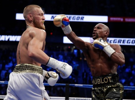 Floyd Mayweather Jr. colpisce con un destro Conor McGregor (AP Photo/Isaac Brekken)